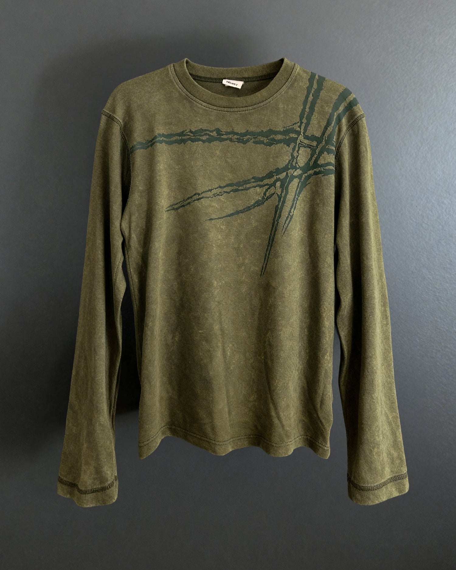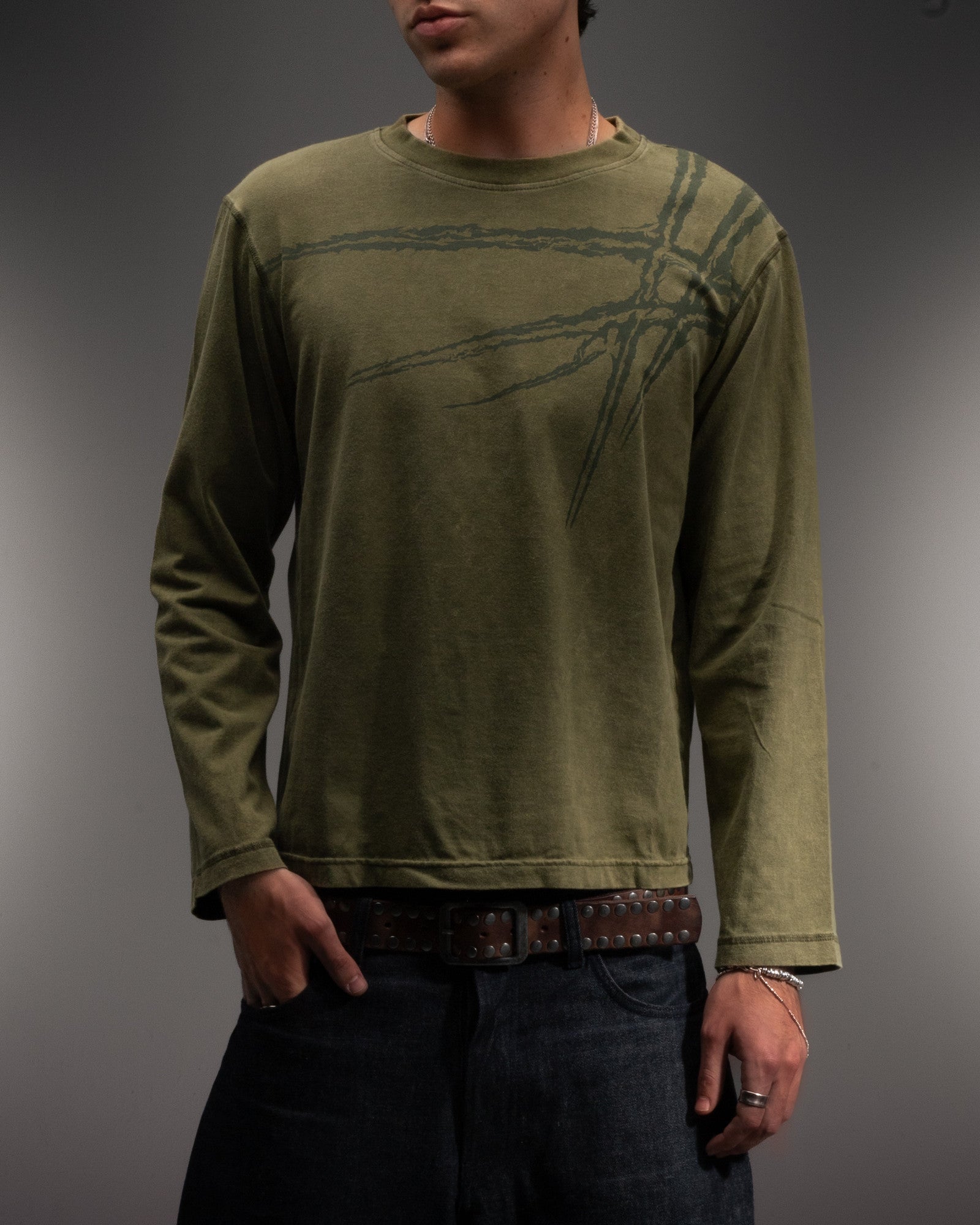 This long sleeve is made from 100% organic cotton and comes with an olive dye finish with a worn-in look. The scar graphic is fused into the fabric and subtly goes over from the front to the back. Fits slightly cropped with longer sleeves as seen on Milan. Size up for true fit.