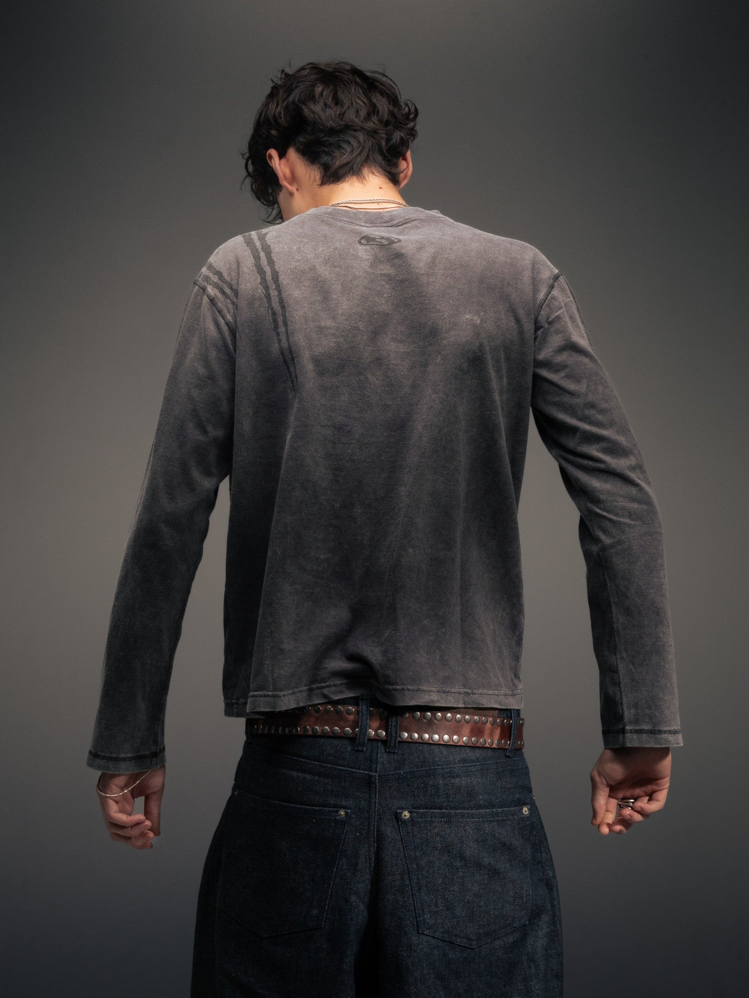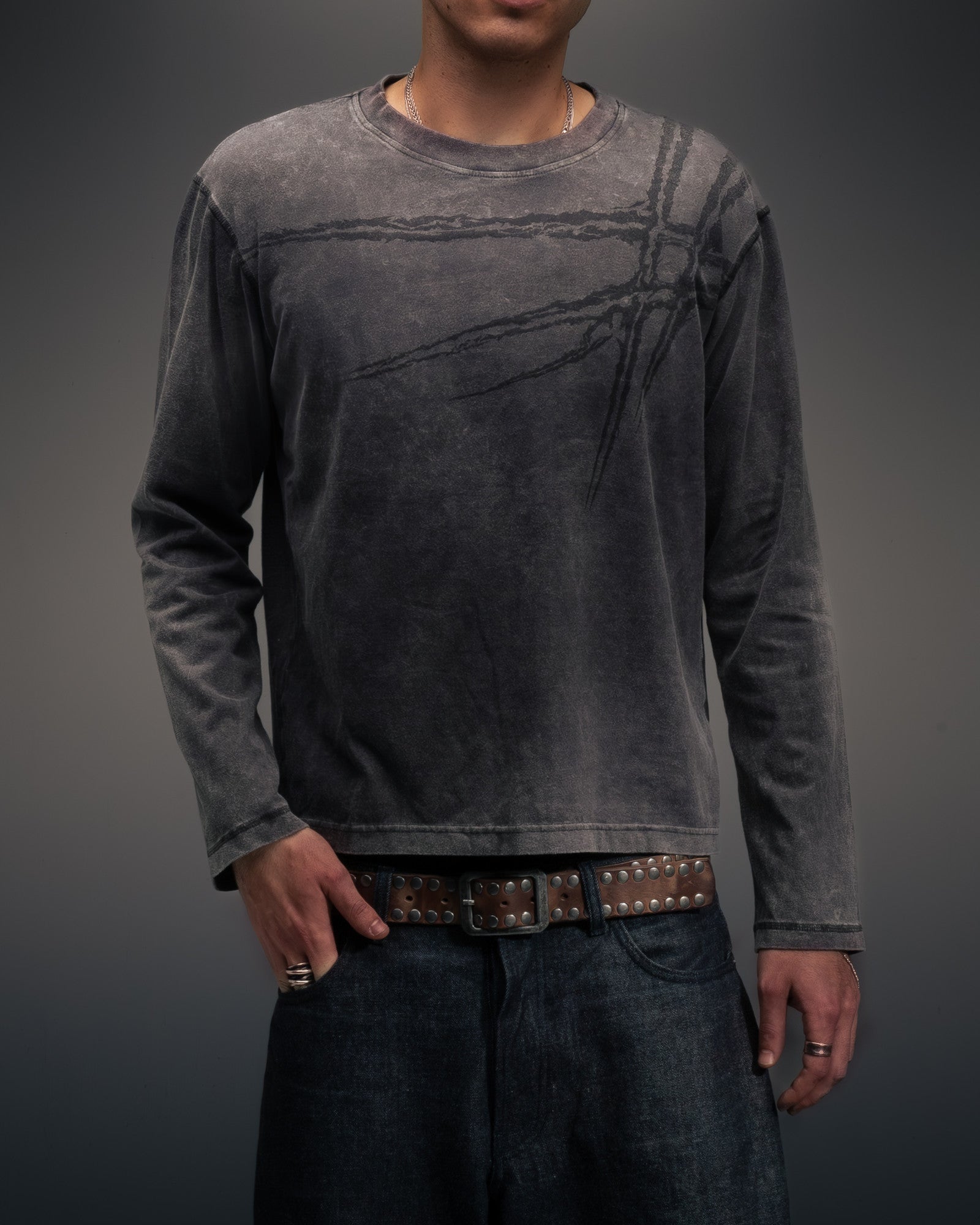 Cut from 6oz organic cotton, this long sleeve is washed down to a charcoal fade. The scar graphic is sublimated into the fabric itself, and wraps over your shoulder like a tattoo. It fits cropped with longer sleeves as seen on Milan. Size up for true fit.